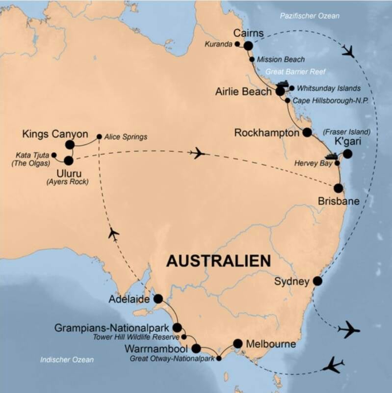 Die nächsten Wochen sind picke packe voll mit Höhepunkten. Ich starte in Melbourne und beende mein Abenteuer in Sydney. Es gibt viel zu erleben - das Land oder der Kontinent ist einfach riesig. Ich reise deshalb auch im Inland noch dreimal mit den Flugzeug, anders kann man in 4 Wochen diese Distanzen wohl nicht bezwingen.
